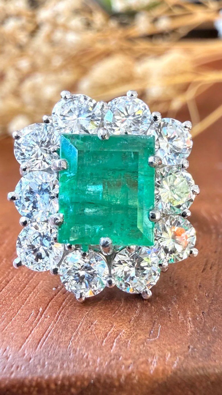 Très jolie bague vintage des années 1960-1980 en platine, émeraude et diamants. De forme rectangulaire a pans coupés, elle est ornée en son centre d’une émeraude d’environ 1,80cts et d’un magnifique entourage de diamants pour environ 2,50cts au total, estimés de couleur et pureté H-I / VVS. Travail Français vintage, anneau très agréable a porter, belles dimensions, bague charismatique.
